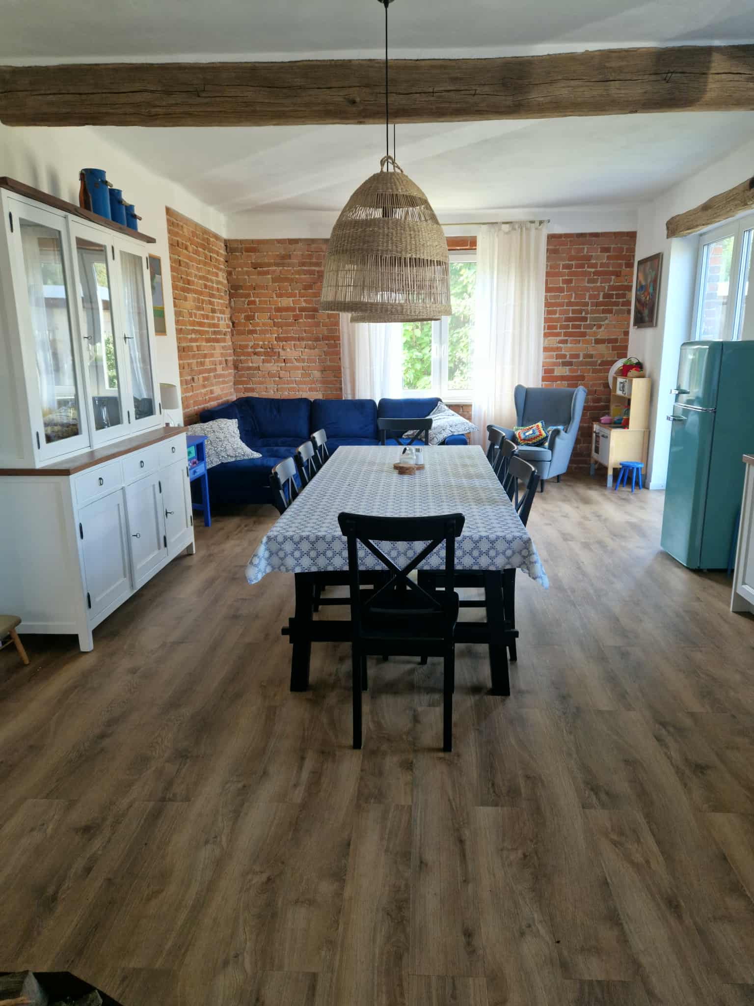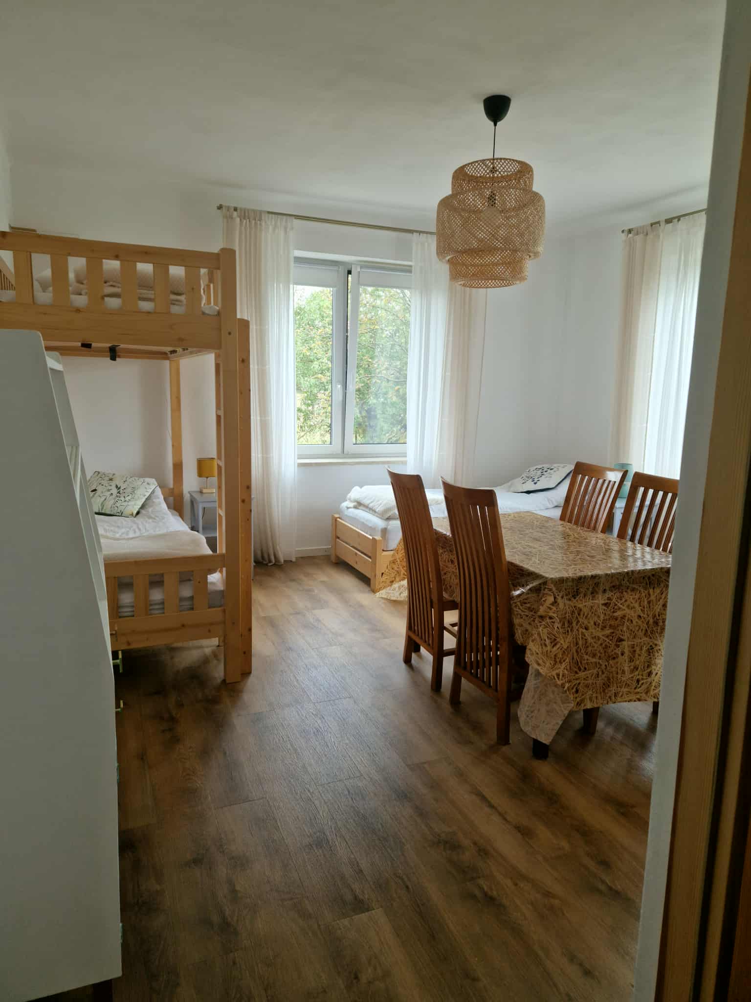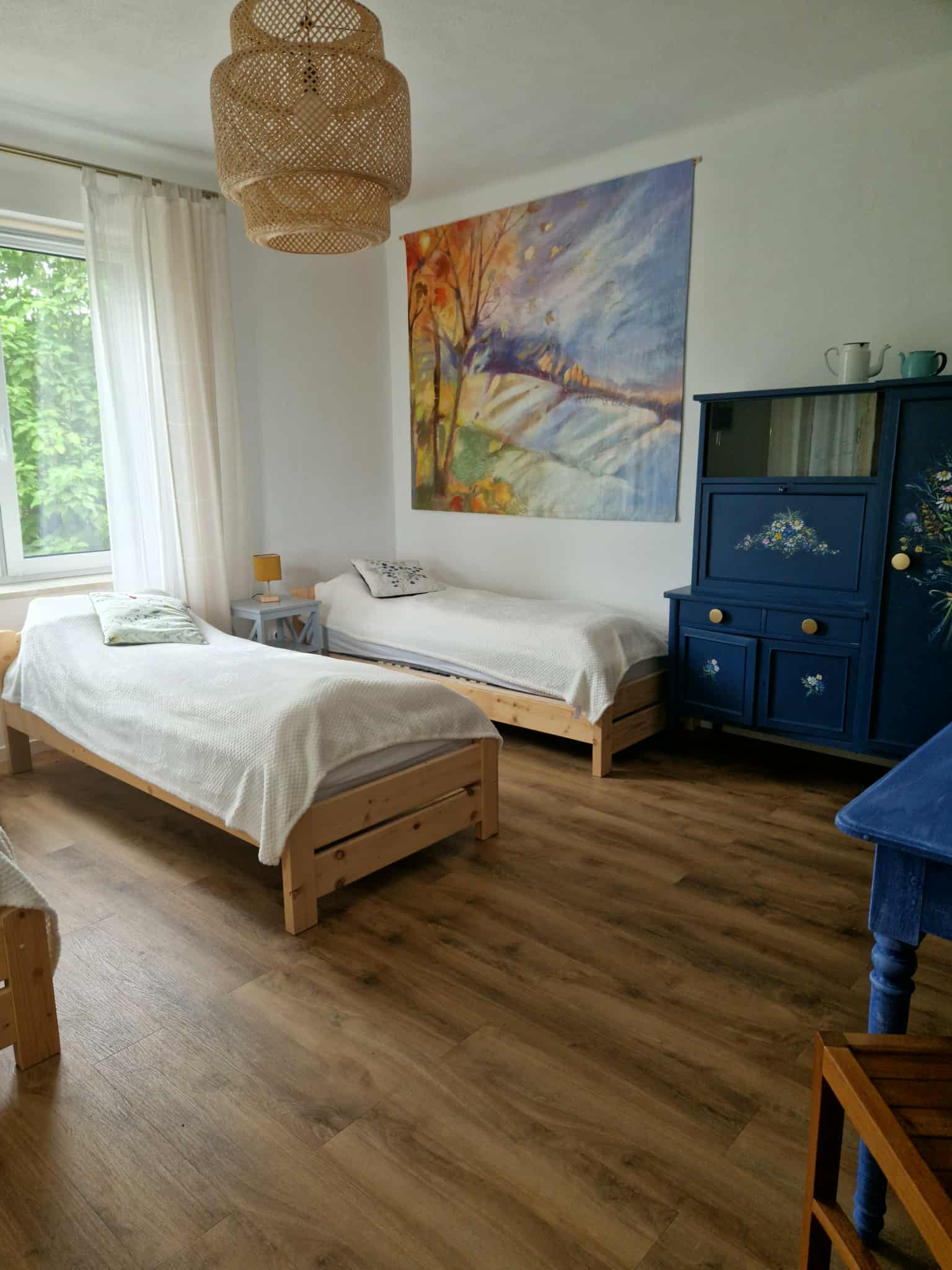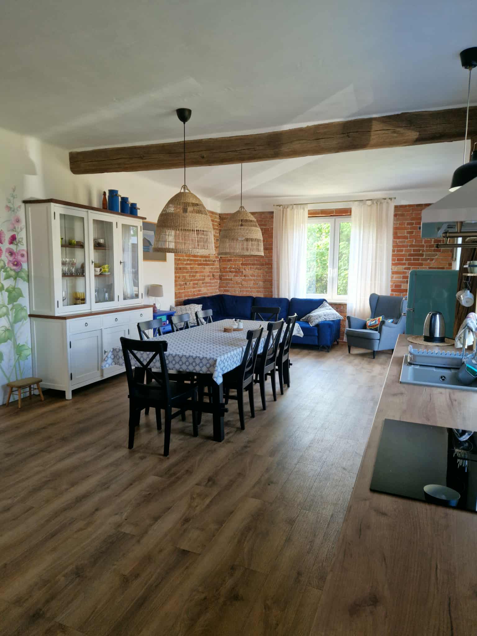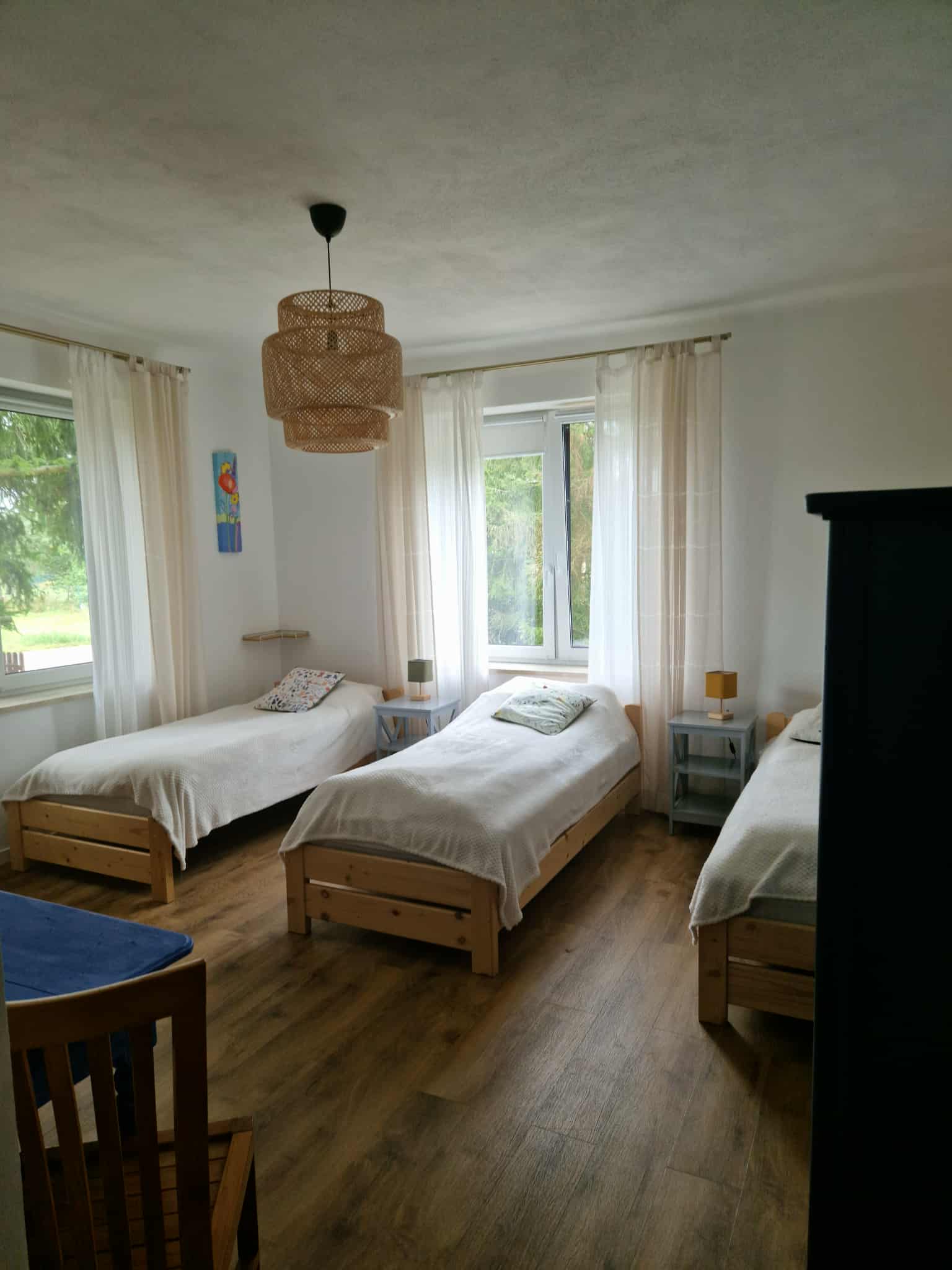 Na obszernym, drewnianym tarasie z widokiem na bezkresne poleskie pola można wypocząć z książką na leżaku, delektować się porannym śniadaniem, a wieczorami podziwiać gwiazdy w strefie ciemnego nieba, szczególnie w sierpniu podczas spadających perseidów. Wyjątkową atmosferę salonu tworzy zachowany, oryginalny kaflowy piec chlebowy – świadectwo dawnych tradycji wiejskiego domu. Ściany zdobią obrazy przedstawiające Hołowno, namalowane podczas pleneru malarskiego, który odbył się kilka lat temu w Krainie Rumianku. Dzięki temu wnętrze nabiera ciepła i lokalnego charakteru. Agroturystyka Rumiłkowo szczególnie ceni sobie najmłodszych gości. Dla nich przygotowano w pełni wyposażoną zabawkową kuchnię, hobby horsa oraz dwie półki z grami planszowymi, puzzlami i zabawkami. Do dyspozycji gości jest także badminton z siatką oraz miejsce na ognisko. Dodatkowo można korzystać z bogatej oferty warsztatowej Ośrodka Edukacji Regionalnej oraz Wiejskiego SPA, z którym sąsiadujemy przez miedzę. To ważne zwłaszcza w deszczowe dni, kiedy wypady do pobliskich atrakcji czy odpoczynek na świeżym powietrzu są utrudnione.