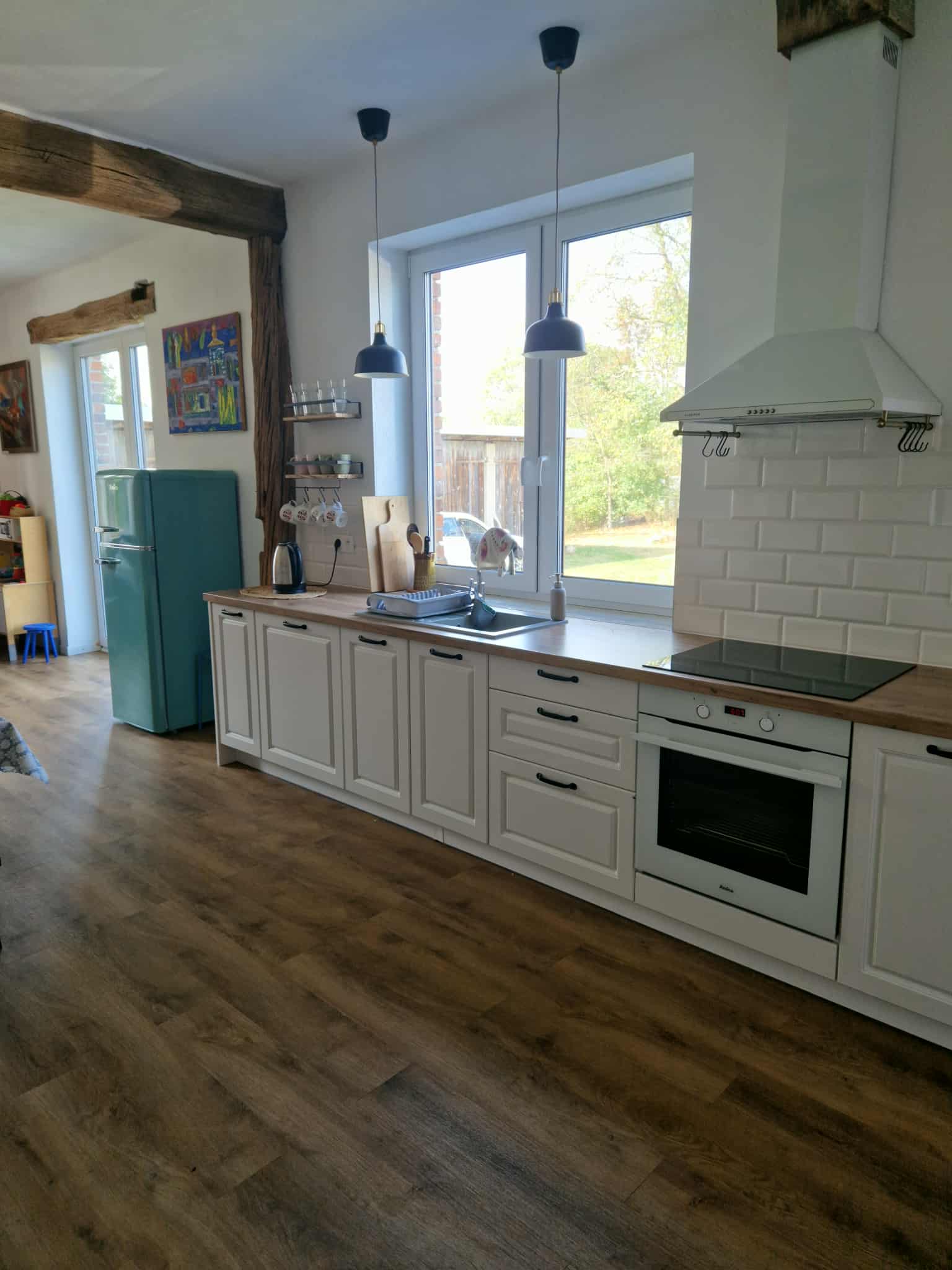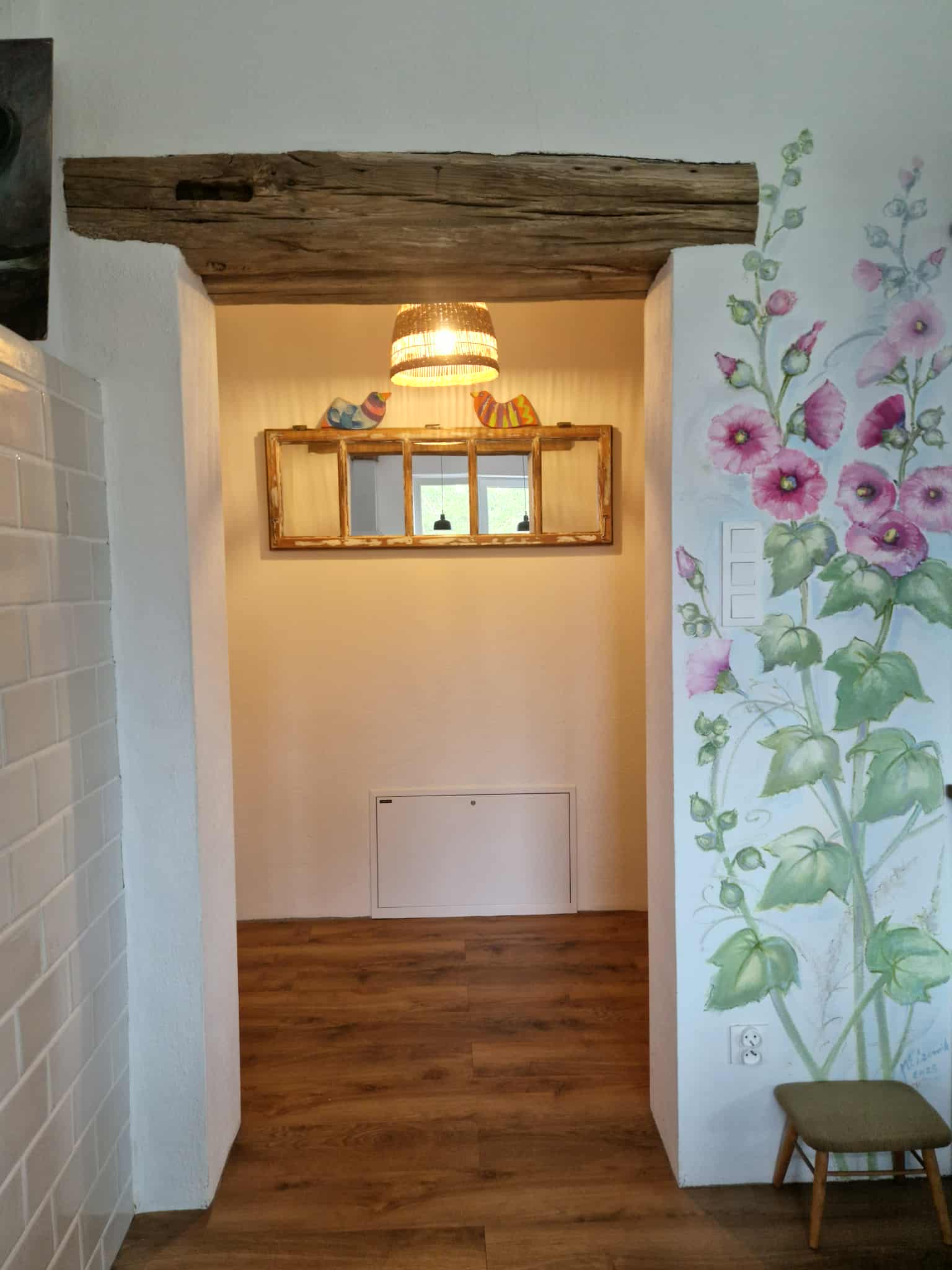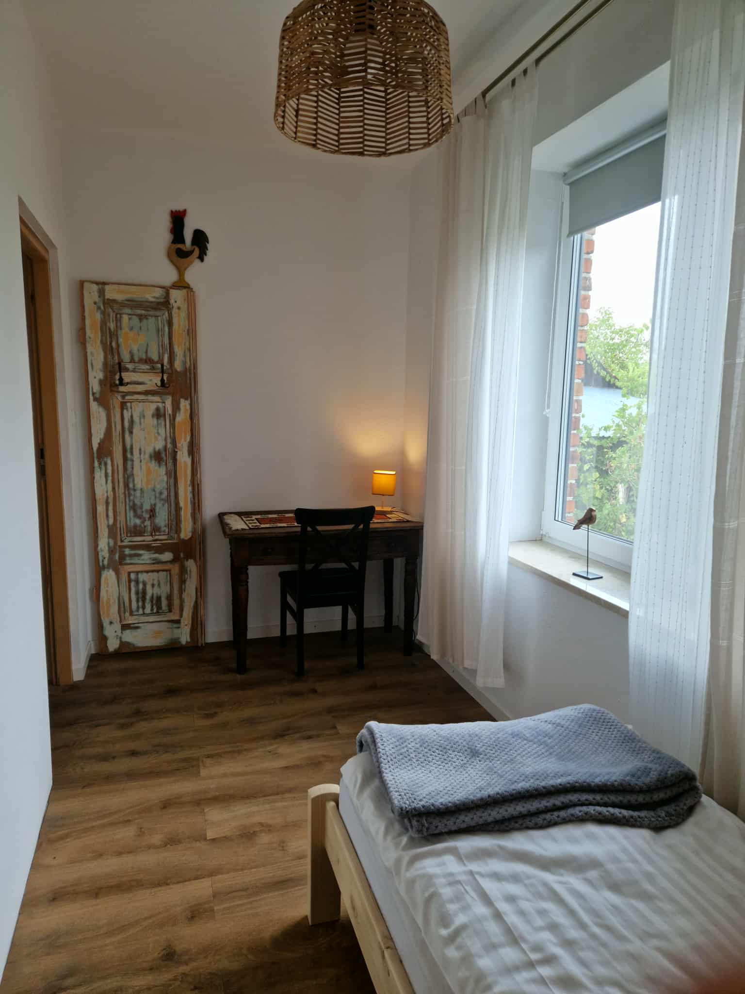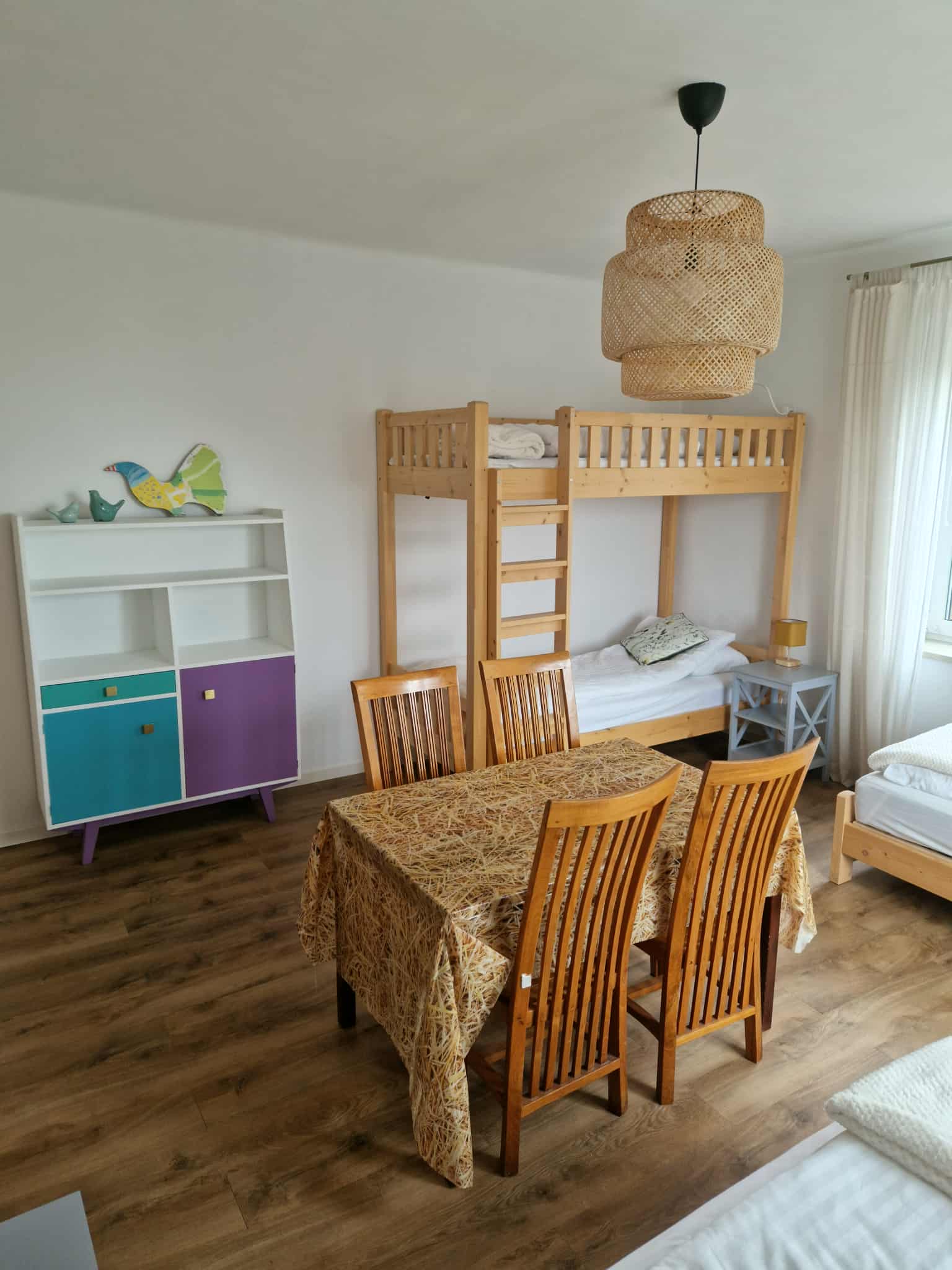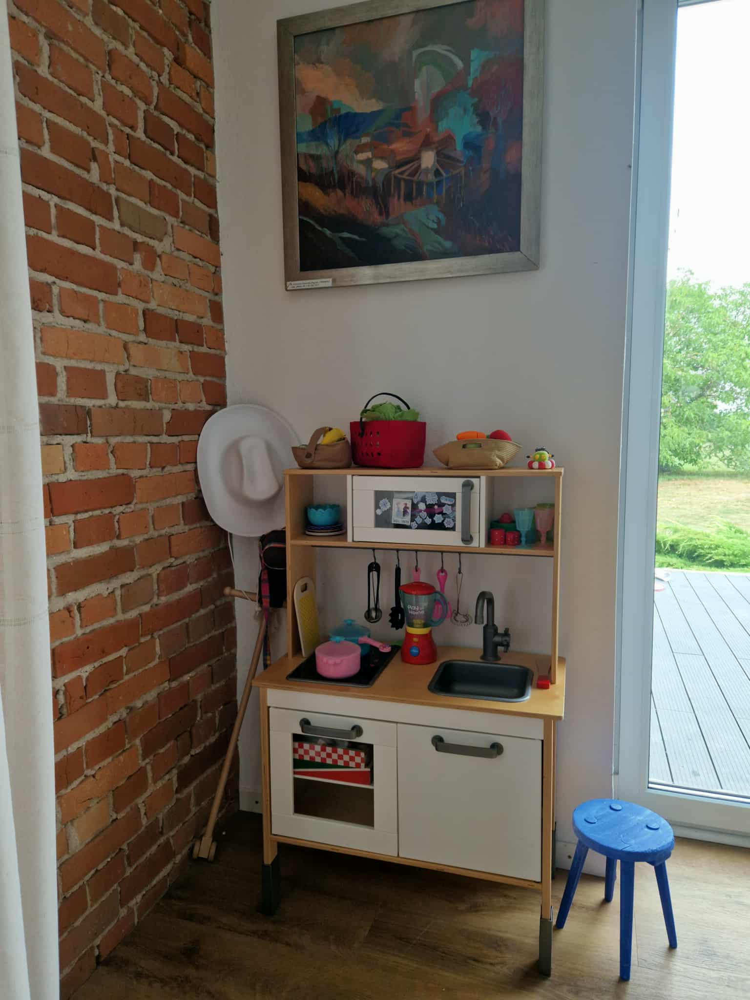 Na obszernym, drewnianym tarasie z widokiem na bezkresne poleskie pola można wypocząć z książką na leżaku, delektować się porannym śniadaniem, a wieczorami podziwiać gwiazdy w strefie ciemnego nieba, szczególnie w sierpniu podczas spadających perseidów. Wyjątkową atmosferę salonu tworzy zachowany, oryginalny kaflowy piec chlebowy – świadectwo dawnych tradycji wiejskiego domu. Ściany zdobią obrazy przedstawiające Hołowno, namalowane podczas pleneru malarskiego, który odbył się kilka lat temu w Krainie Rumianku. Dzięki temu wnętrze nabiera ciepła i lokalnego charakteru. Agroturystyka Rumiłkowo szczególnie ceni sobie najmłodszych gości. Dla nich przygotowano w pełni wyposażoną zabawkową kuchnię, hobby horsa oraz dwie półki z grami planszowymi, puzzlami i zabawkami. Do dyspozycji gości jest także badminton z siatką oraz miejsce na ognisko. Dodatkowo można korzystać z bogatej oferty warsztatowej Ośrodka Edukacji Regionalnej oraz Wiejskiego SPA, z którym sąsiadujemy przez miedzę. To ważne zwłaszcza w deszczowe dni, kiedy wypady do pobliskich atrakcji czy odpoczynek na świeżym powietrzu są utrudnione.